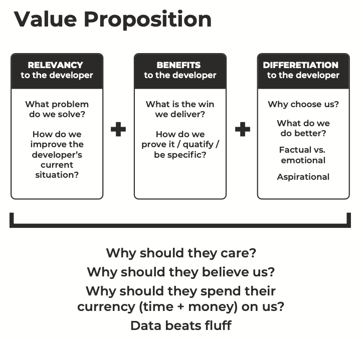 You should ensure that you can confidently outline the product value proposition to developers as well as product market fit.