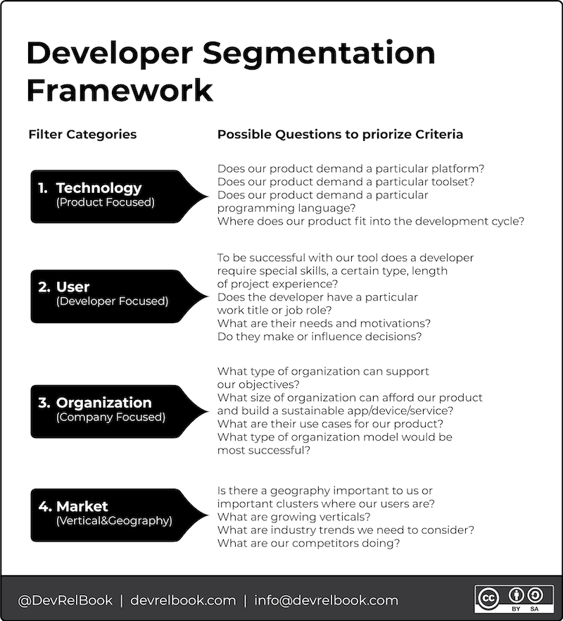 Your marketing team, especially if they have a developer marketing focus, should already have these areas defined as it's imperative for successful marketing. However, if your marketing team does not have defined segmentations, personas, & positioning, you may have to dive in and take the lead. You want to ensure the entire company leverages and understands the developer audiences defined.